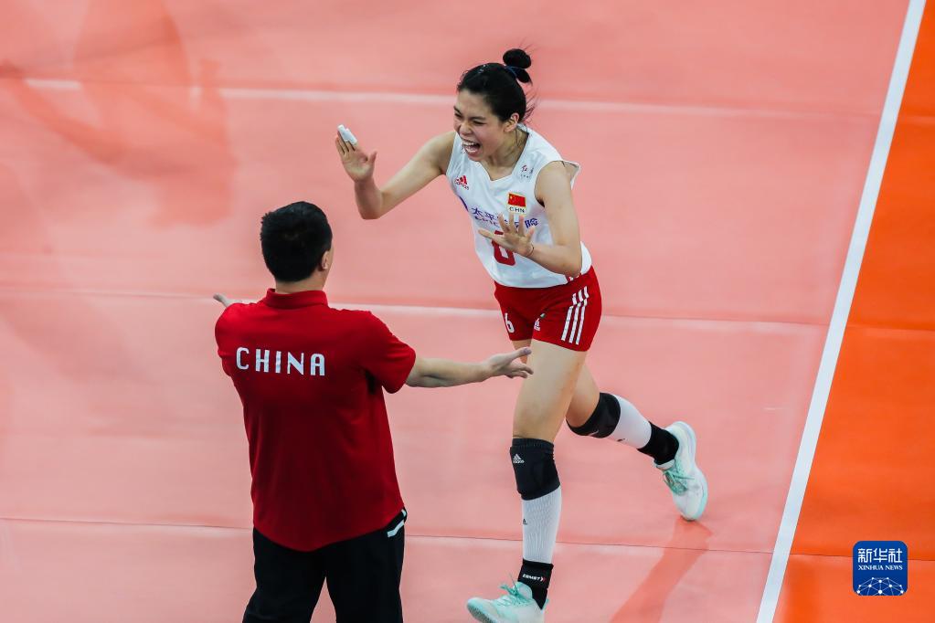 8月28日,中国队球员庄宇珊(右)在比赛中与教练匡琦击掌庆祝得分。新华社发(乌马利摄)