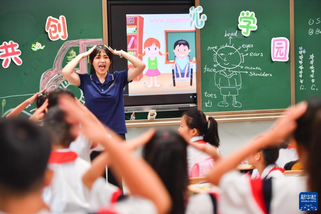 8月29日,在长沙市天心区青园南湖小学,老师在英语课上和学生互动。