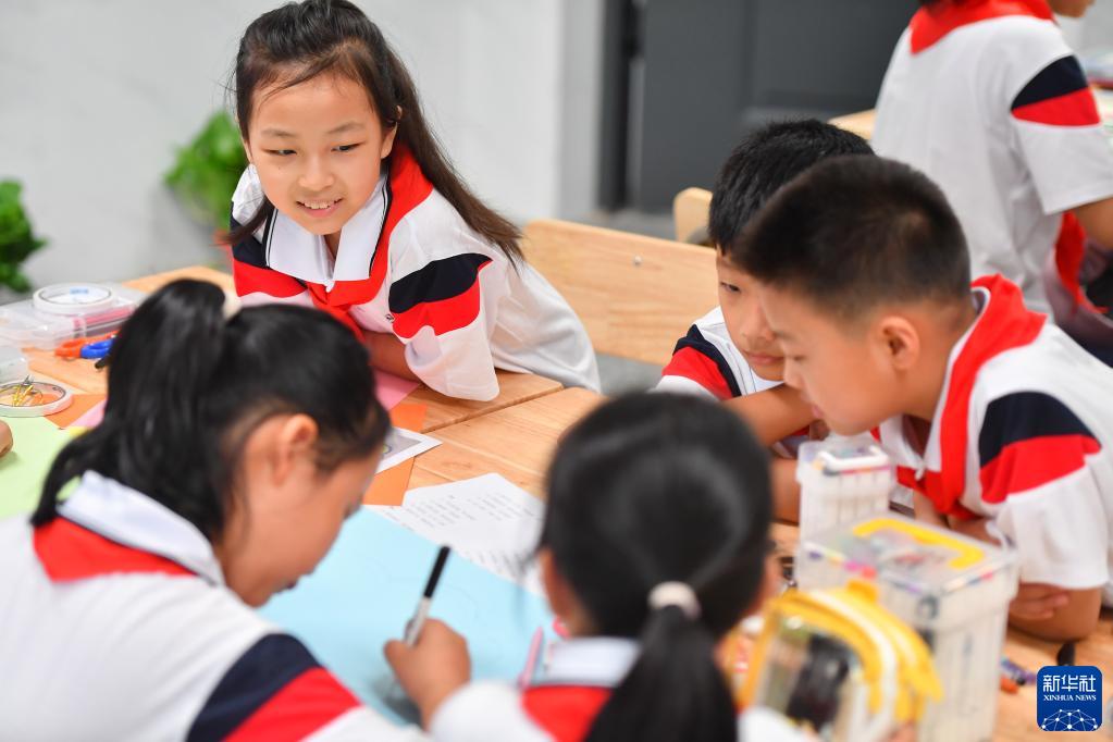 8月29日,在长沙市天心区青园南湖小学,学生在劳动课上讨论工艺作品制作。