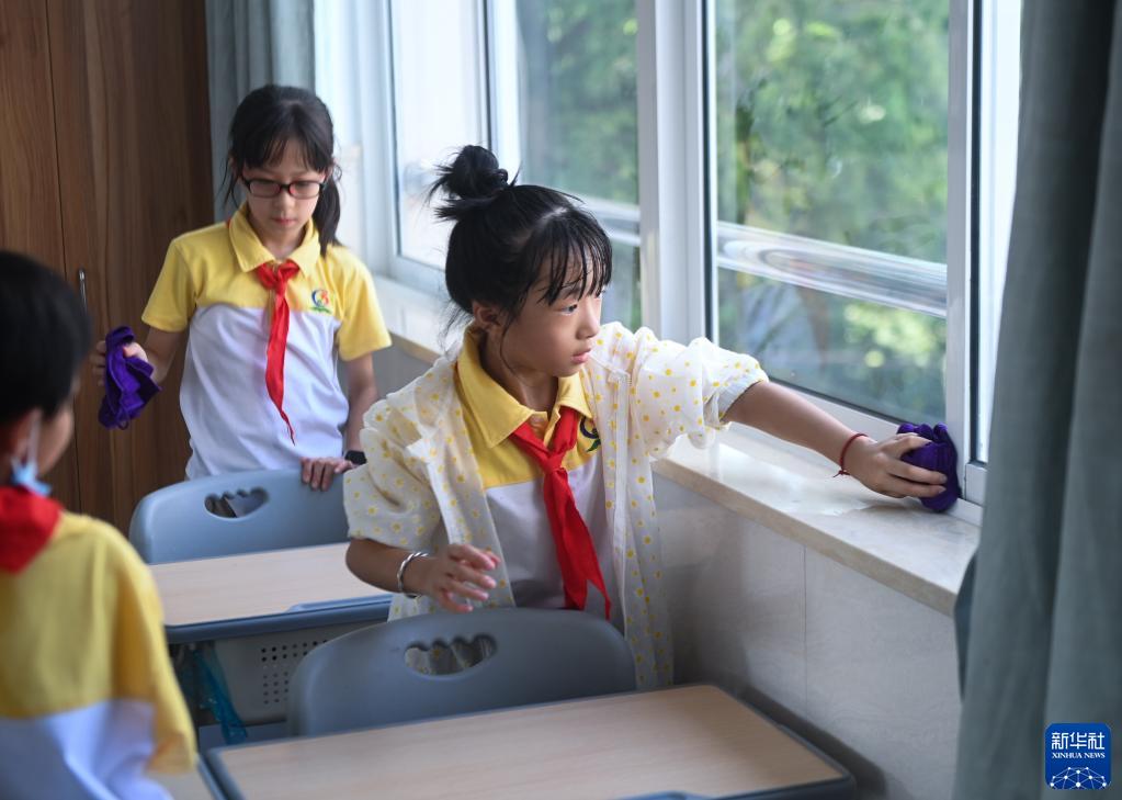 8月29日,龙泉小学的学生在打扫教室,开启新学期“开学第一课”。