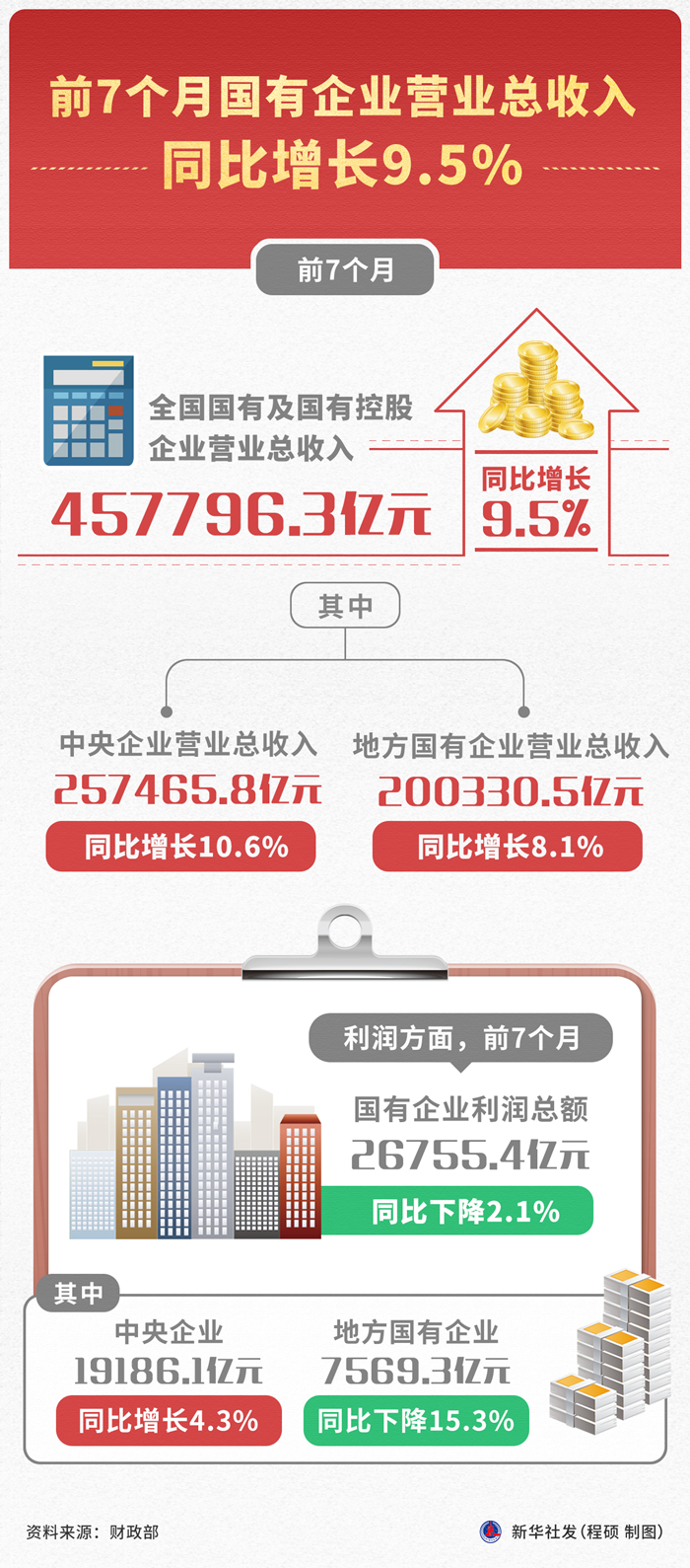 新华社北京8月29日电 财政部29日发布数据显示,前7个月,全国国有及国有控股企业营业总收入457796.3亿元,同比增长9.5%。其中,中央企业营业总收入257465.8亿元,同比增长10.6%;地方国有企业营业总收入200330.5亿元,同比增长8.1%。