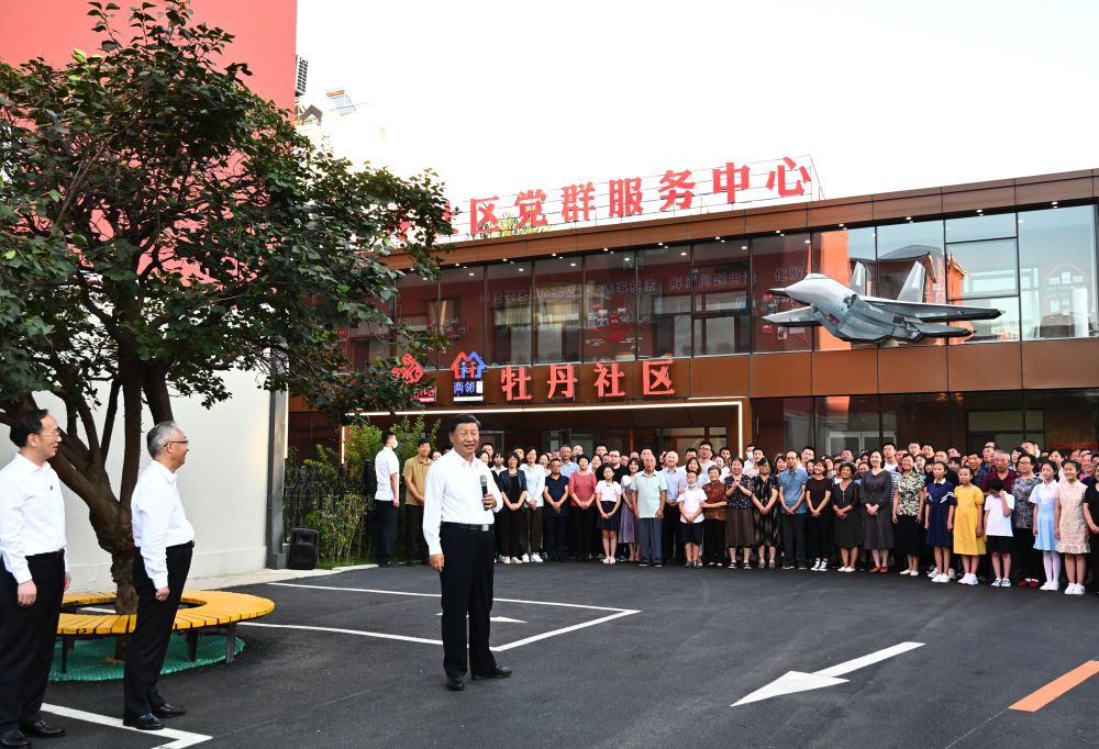↑2022年8月17日,习近平在辽宁省沈阳市皇姑区三台子街道牡丹社区考察时,同社区居民群众亲切交流。