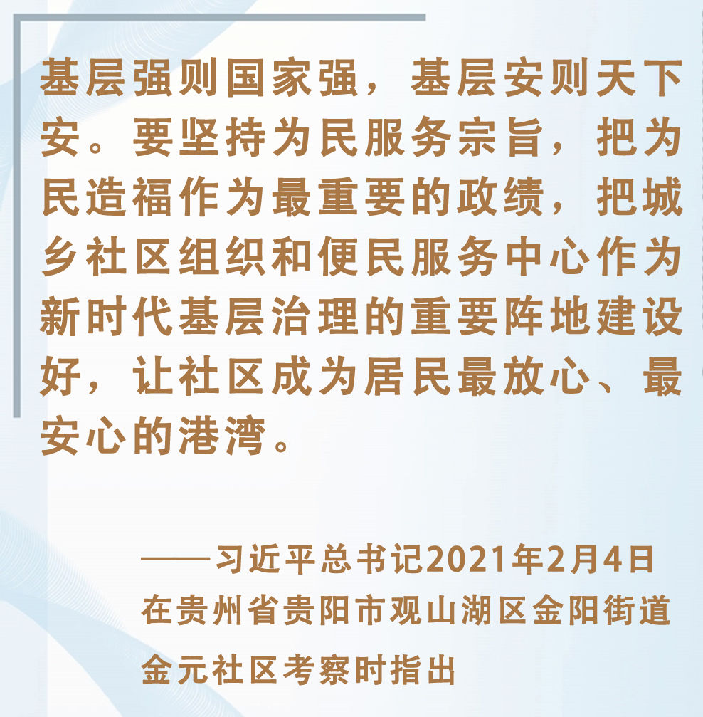社区是党和政府联系、服务居民群众的“最后一公里”。各地坚持人往基层走、钱往基层投、政策向基层倾斜,着力增强社区党组织为民、便民、安民功能,将党的工作融入万家灯火,把党的服务送到千家万户,让社区成为群众最放心、最安心的港湾。