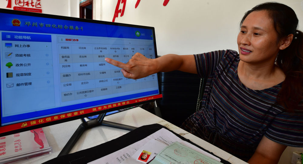 ↑在河南省邓州市花洲街道办事处中州家园社区为民服务大厅,工作人员介绍网上办事平台进驻的单位(2018年8月8日摄)。