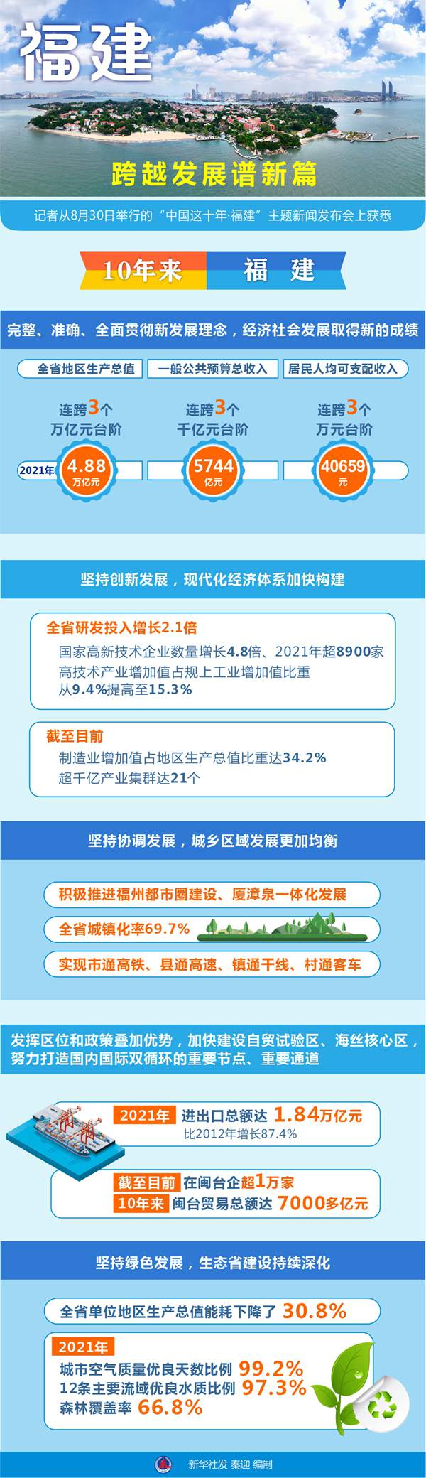 尹力介绍,福建完整、准确、全面贯彻新发展理念,经济社会发展取得新的成绩。10年来,全省地区生产总值连跨3个万亿元台阶,年均增长8.1%,2021年达4.88万亿元;一般公共预算总收入连跨3个千亿元台阶,年均增长7.4%,2021年达5744亿元;居民人均可支配收入连跨3个万元台阶,年均增长8.5%,2021年达40659元。