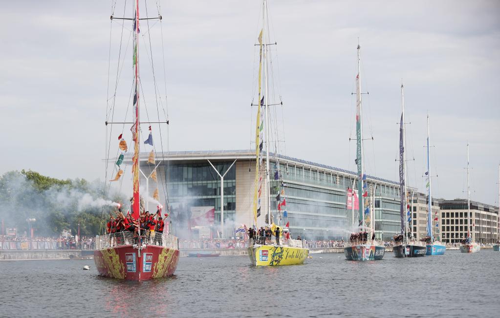 ↑7月30日,11支经历了4万余海里环球航行的克利伯环球帆船赛船队回归始发点伦敦。新华社记者李颖摄