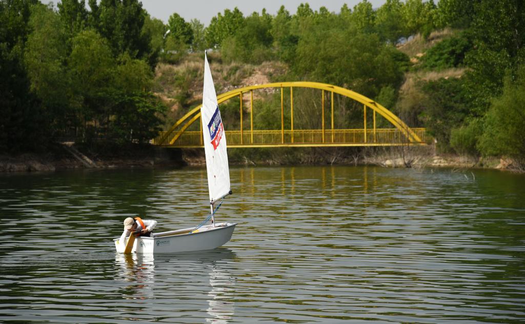 ↑帆船运动爱好者在济南雪野湖上操控帆船。新华社记者王凯摄