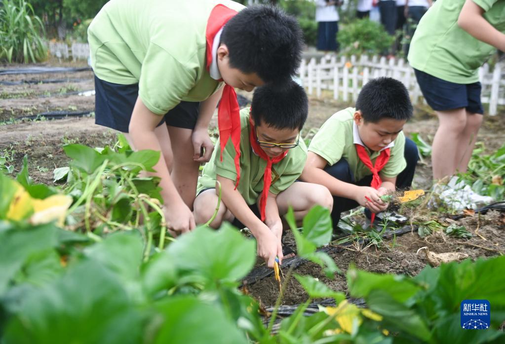 当日,在浙江省嘉兴市南湖区新丰镇中心小学的校园农场内,学生们参加收番薯、除草、浇水等特色劳动课程,开启新学期的“开学第一课”。新丰镇中心小学是浙江省拓宽校外劳动实践途径试点学校,依托校园农场形成了特色鲜明的劳动课程。