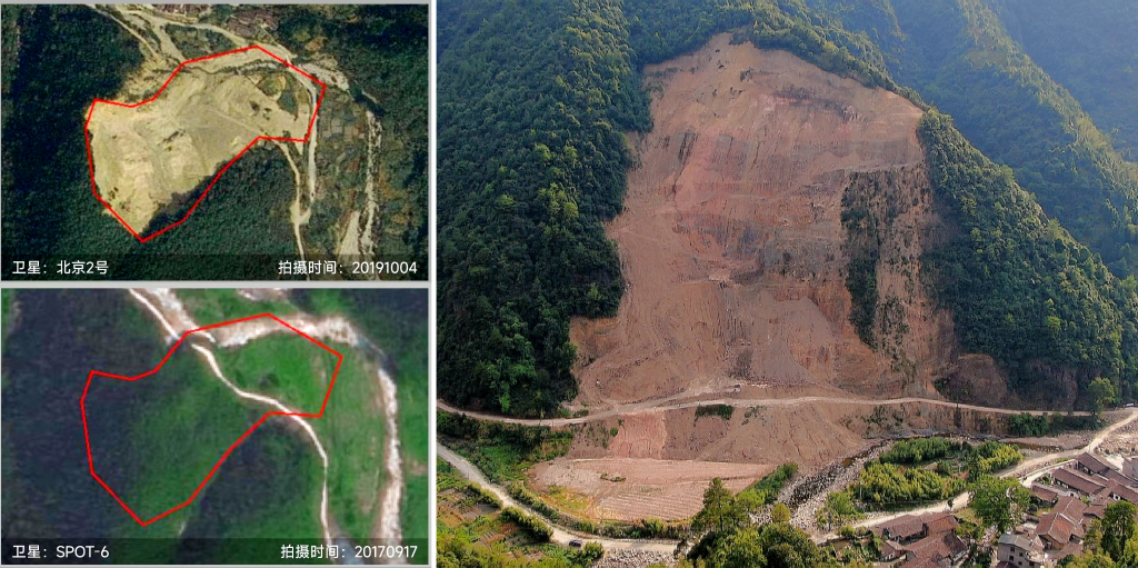 村民提供的老照片及卫星图片显示,直到2018年,这片山地还覆满绿色植被,山间道路通畅。