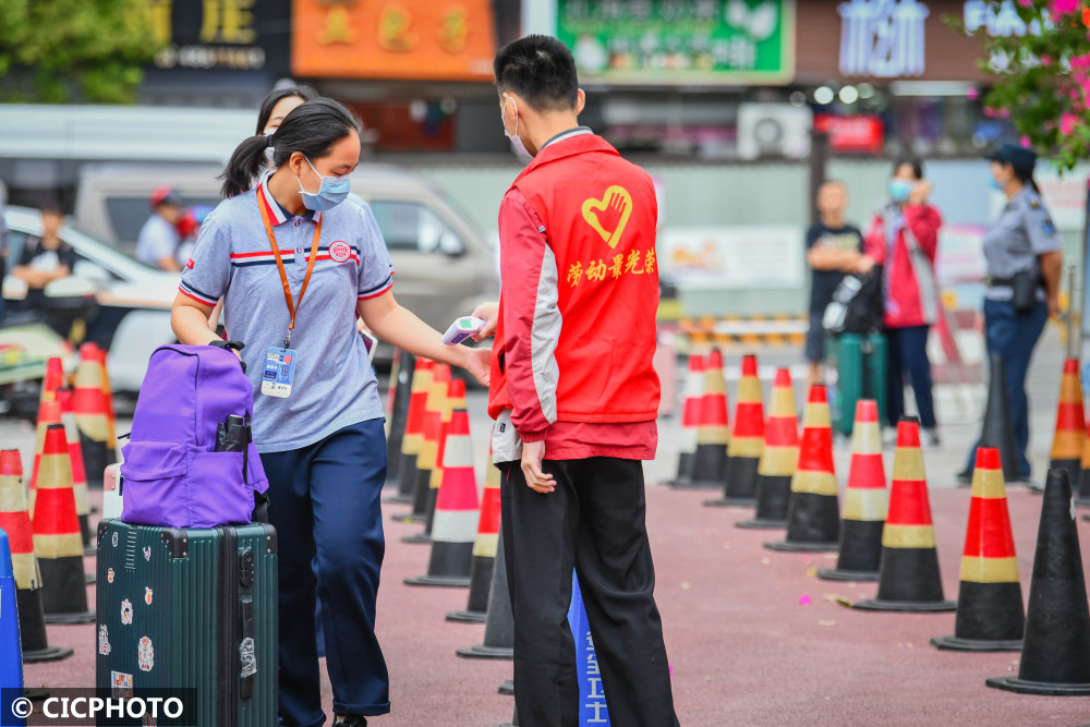 ↑2022年8月31日,重庆市綦江区南州中学的学生有序入校进行体温检测。CICPHOTO/陈星宇 摄