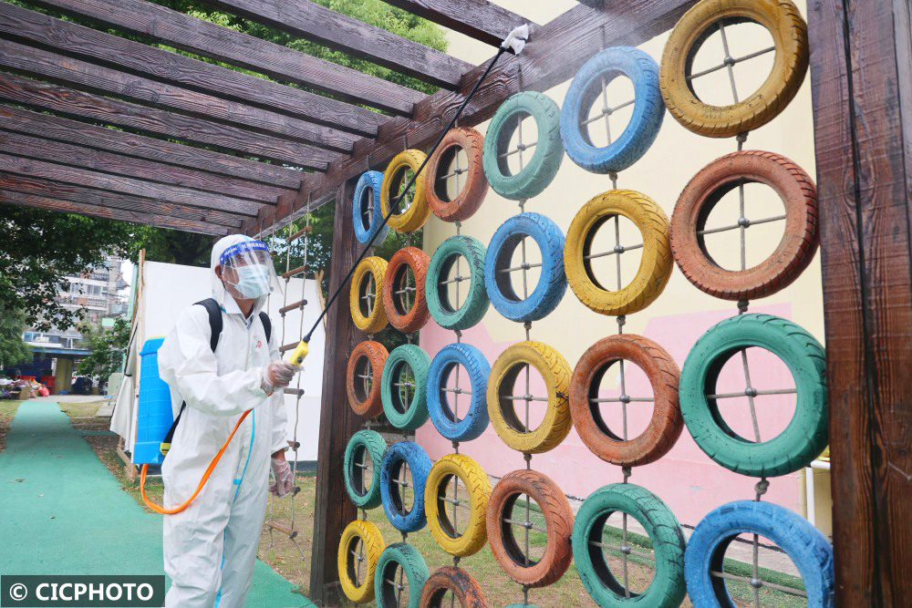 ↑2022年8月31日,江苏省南通市南通师范第一附属小学幼儿园的工作人员在进行消杀作业。CICPHOTO/徐培钦 摄