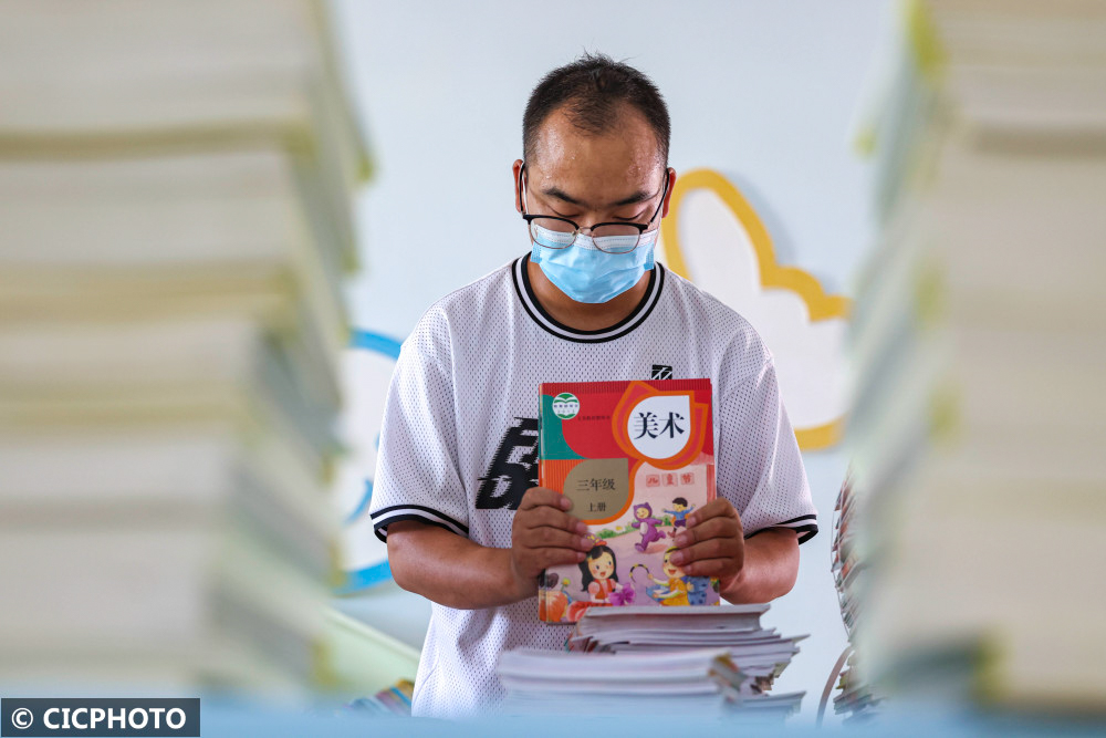 ↑2022年8月30日,新疆库车市第十小学的教师在对教材进行归类和配发。CICPHOTO/袁欢欢 摄