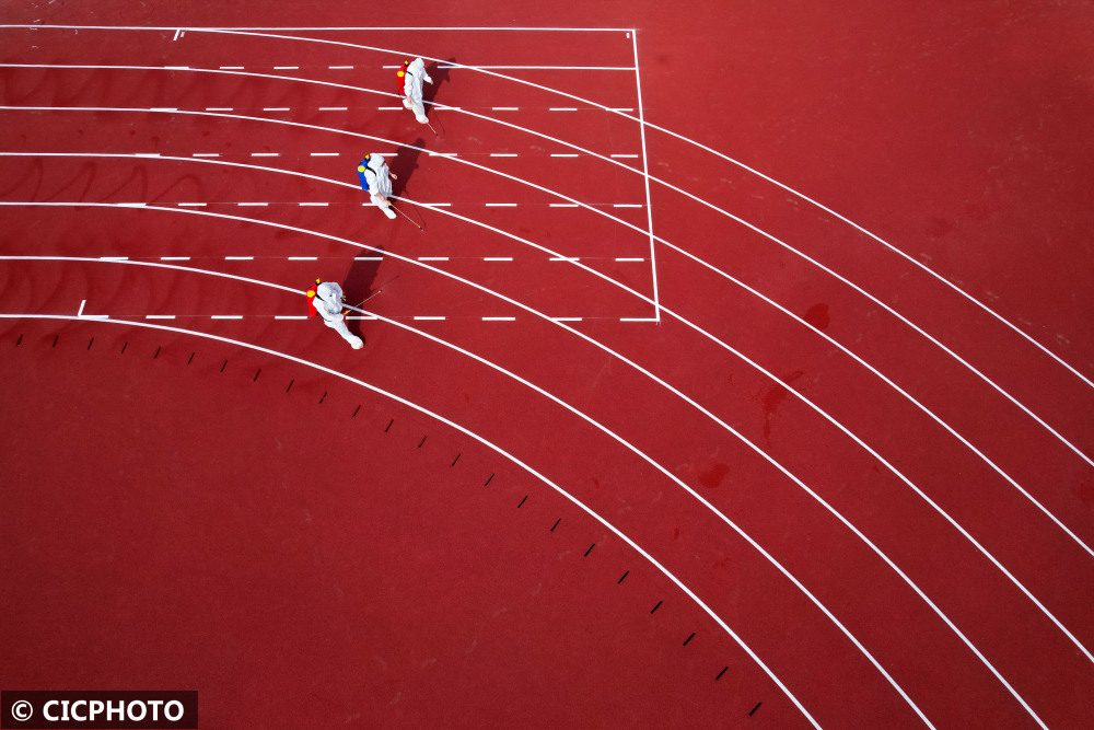 ↑2022年8月28日,四川省内江市东兴区牛牦山小学的防疫工作人员在校园内进行消杀作业。(无人机照片)。CICPHOTO/兰自涛 摄