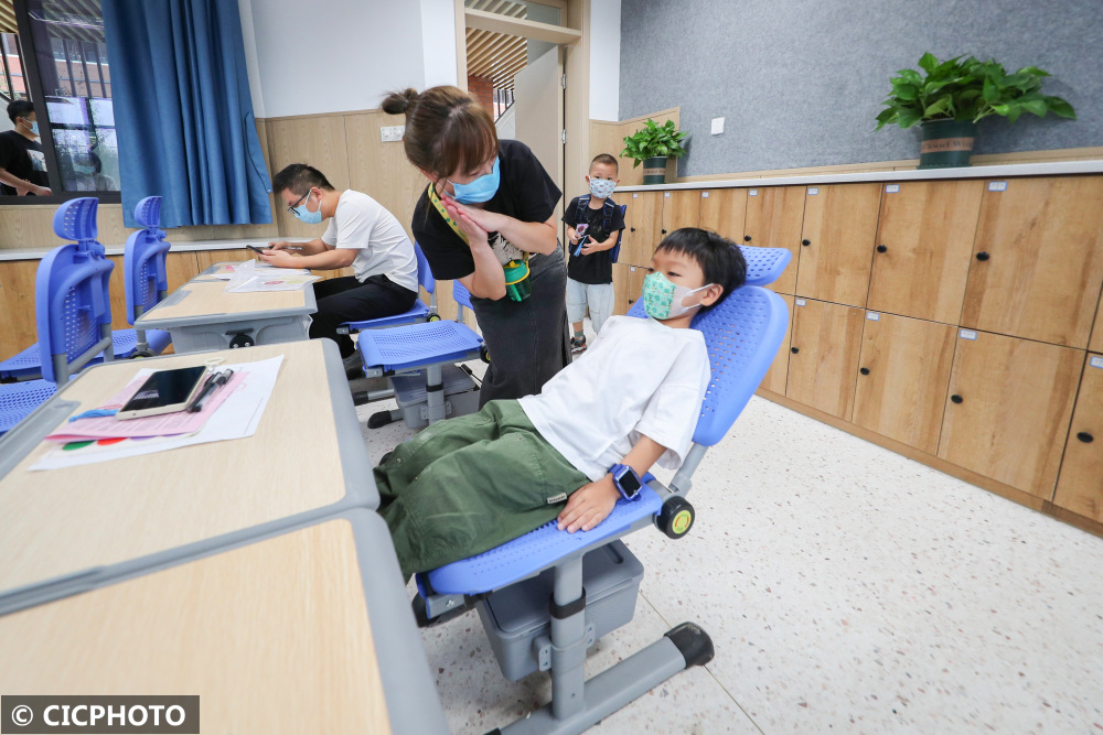 ↑2022年8月31日,浙江省湖州市德清县凤栖小学,一年级新生在体验午睡椅。CICPHOTO/蔡俊 摄