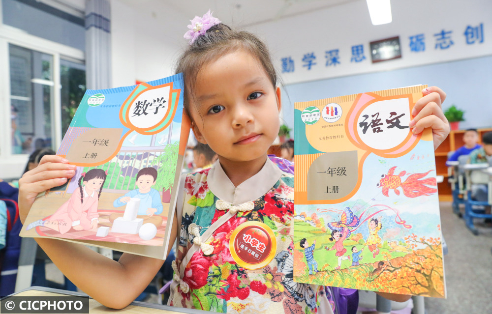 ↑2022年8月31日,浙江省湖州市德清县实验学校,一年级新生在展示领取的新教材。CICPHOTO/王树成 摄