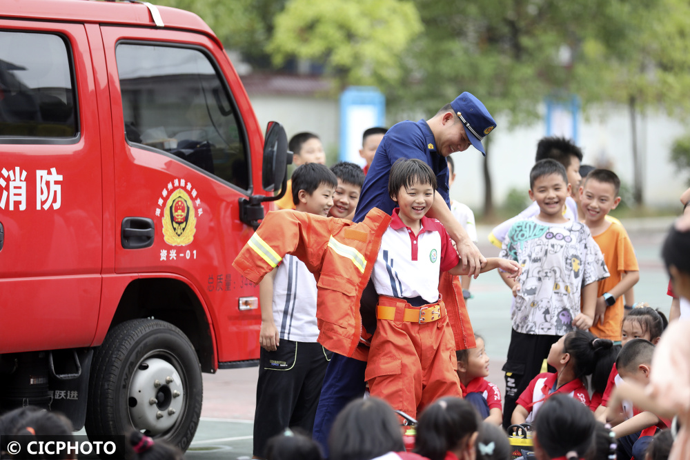 ↑2022年8月30日,湖南省资兴市第二完全小学的学生们在消防救援人员的指导下体验穿着抢险救援服。CICPHOTO/李科 摄