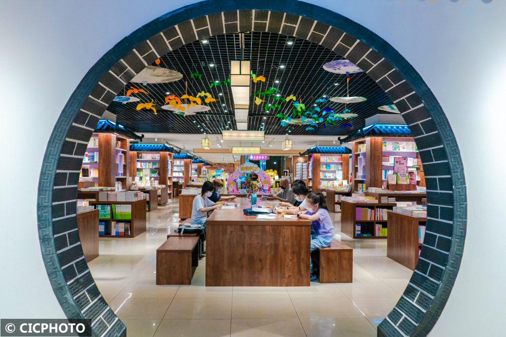 ↑2022年8月28日,重庆市渝中区新华书店内,家长带着孩子们选购课外读物和辅导教材,为新学期做准备。CICPHOTO/李洪波 摄