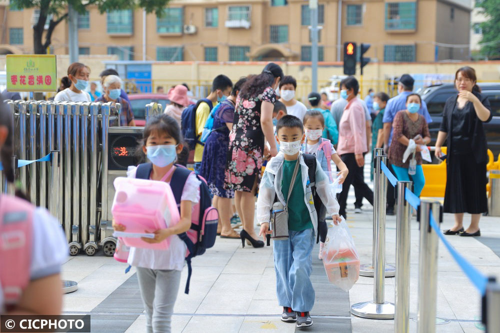 ↑2022年8月31日,山东省青岛市李沧区枣山路小学的学生们有序入学报到。CICPHOTO/张鹰 摄