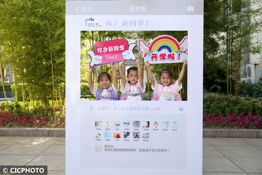 ↑2022年8月30日,浙江省东阳市吴宁第一小学的学生在“欢迎新同学”的展板旁合影留念。CICPHOTO/胡扬辉 摄