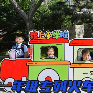 ↑2022年8月31日,山东省青州市宏德小学一年级的新生在校园内拍照留影。CICPHOTO/王继林 摄