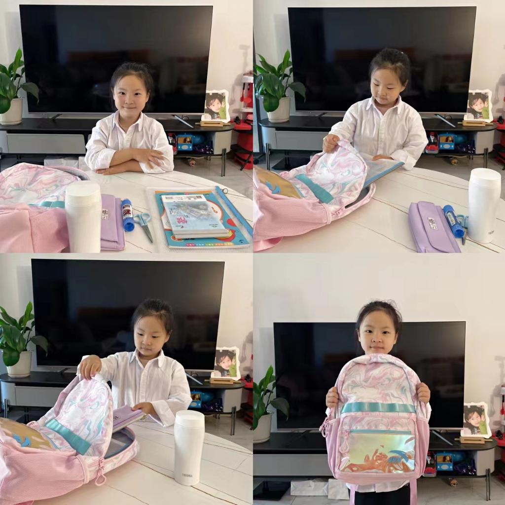 线上课堂中,哈尔滨新区第一学校一名一年级学生整理书包
