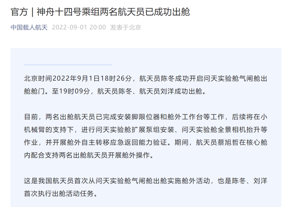 北京时间2022年9月1日18时26分,航天员陈冬成功开启问天实验舱气闸舱出舱舱门。至19时09分,航天员陈冬、航天员刘洋成功出舱。