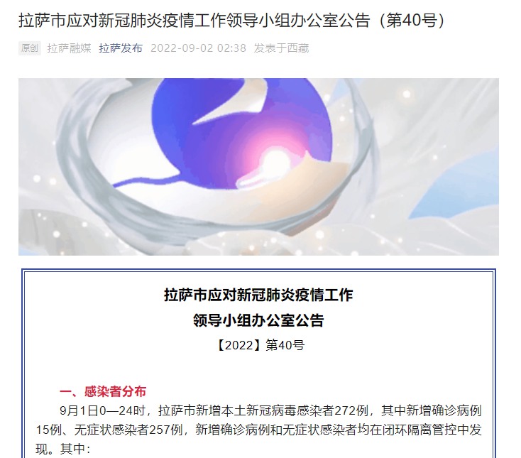 9月1日0—24时,拉萨市新增本土新冠病毒感染者272例,其中新增确诊病例15例、无症状感染者257例,新增确诊病例和无症状感染者均在闭环隔离管控中发现。其中: