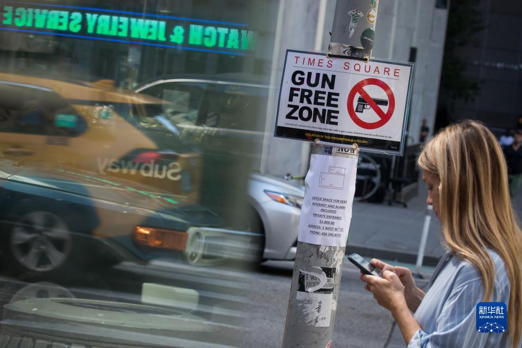 9月1日,人们从美国纽约时报广场邻近街区的“禁枪区”标志牌旁走过。