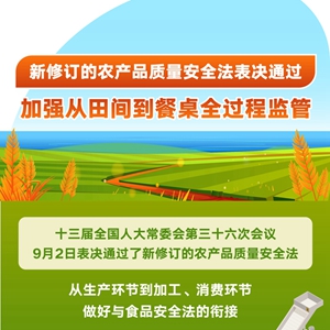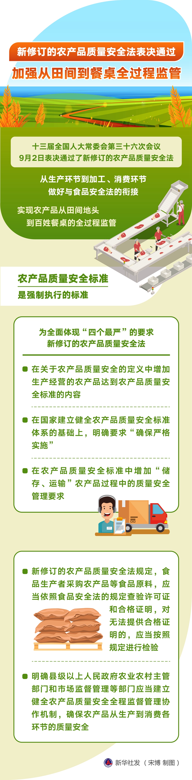 新华社北京9月2日电(记者于文静)十三届全国人大常委会第三十六次会议2日表决通过了新修订的农产品质量安全法,从生产环节到加工、消费环节,做好与食品安全法的衔接,实现农产品从田间地头到百姓餐桌的全过程监管。