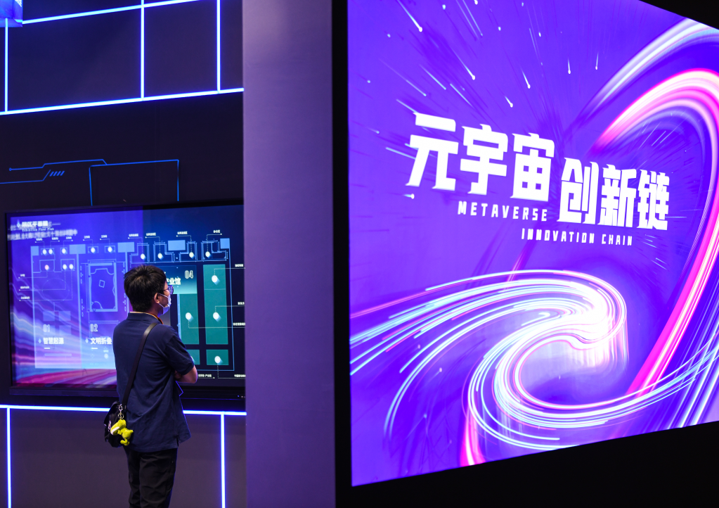 9月1日,在2022年服贸会首钢园区,参观者在了解元宇宙创新链和产业链技术成果。新华社记者 韩旭 摄