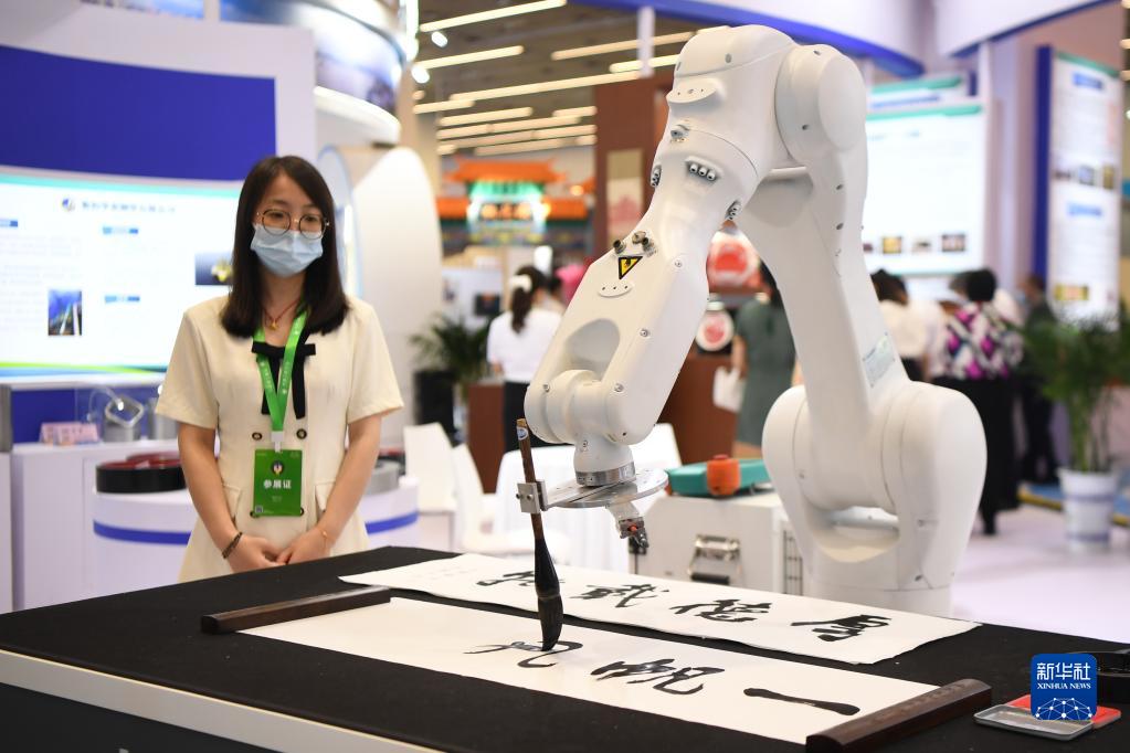 这是9月2日在论坛期间举办的湖湘劳模工匠创新成果展上拍摄的机械臂写书法展示。新华社记者 薛宇舸 摄