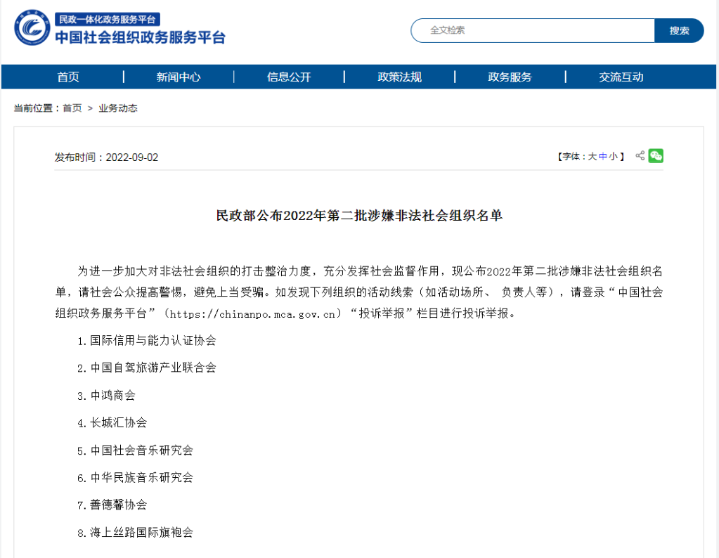 民政部2日公布2022年第二批涉嫌非法社会组织名单,包括国际信用与能力认证协会等8家。