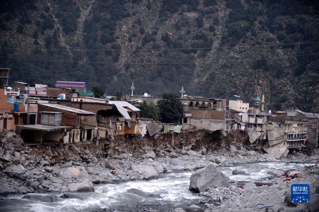 这是9月1日在巴基斯坦开伯尔-普什图省斯瓦特地区拍摄的被洪水损毁的房屋。