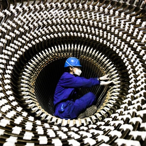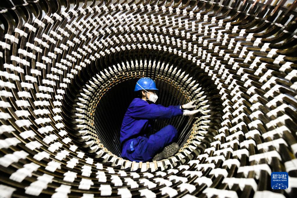 9月3日,在哈电集团哈尔滨电机厂有限责任公司的生产车间,工人在进行生产作业。