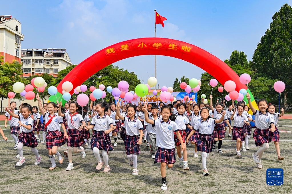 9月1日,山东青州经济开发区小学学生手持气球在操场上奔跑。当日,全国多地中小学开学。
