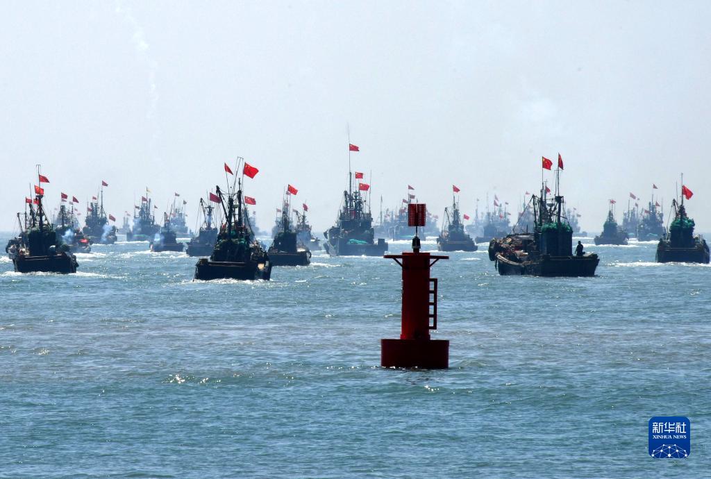 9月1日,在青岛西海岸新区积米崖海域,渔船驶离码头。当日,黄渤海为期4个月的休渔期结束,所涉渔区渔船陆续出海,有序开展秋汛捕捞作业。
