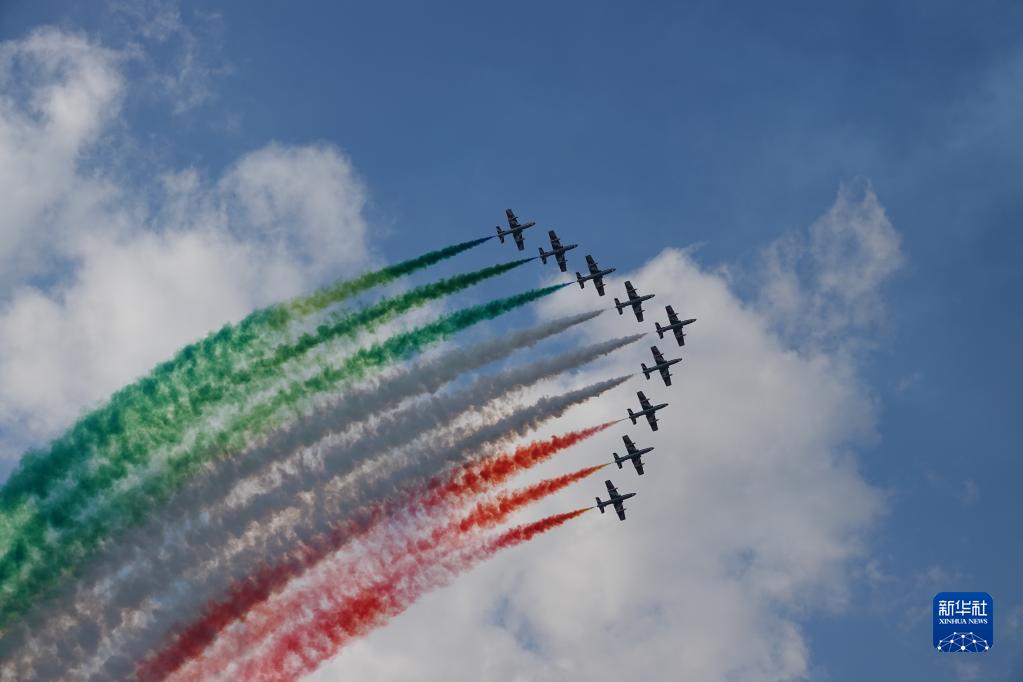 9月2日,意大利“三色箭”飞行表演队在奥地利“空中力量-2022”航展上表演。