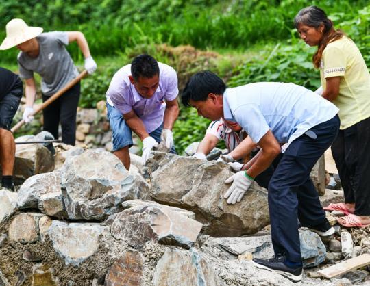 贵州省黔东南州剑河县老党员杨精泽(前右)与帮扶干部、村干部、村民在台沙村共筑防洪堤(2020年6月29日摄) 杨文斌摄/本刊