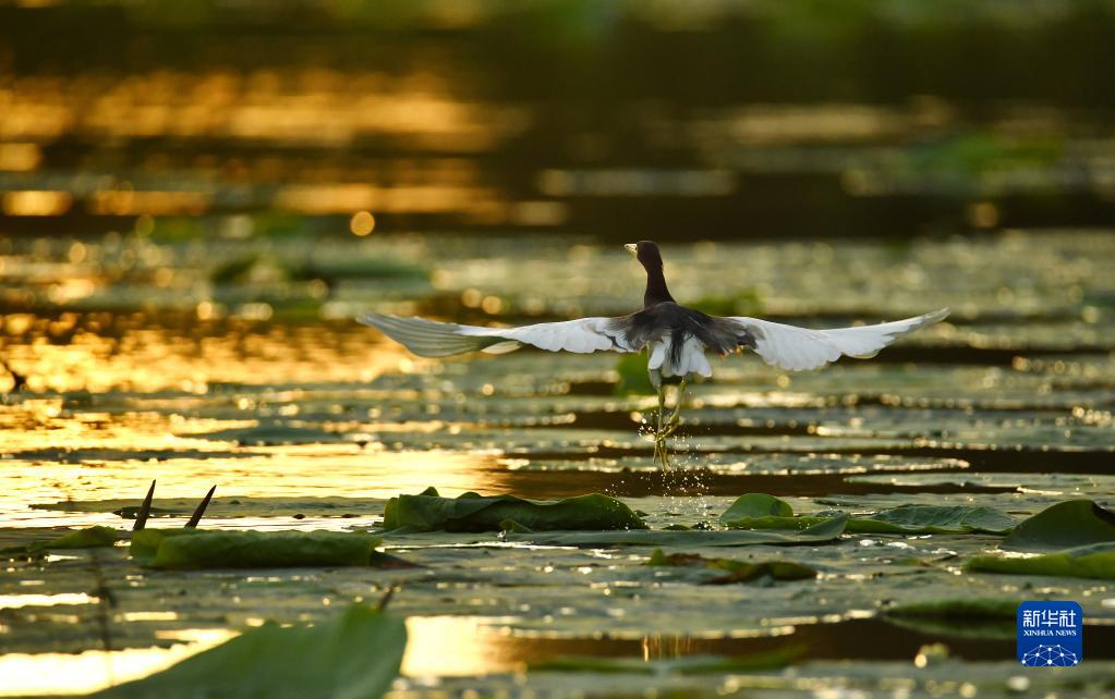 8月23日,在河北省沧县纸房头镇大白洋桥三村的荷园里,水鸟在荷叶间“翩翩起舞”。
