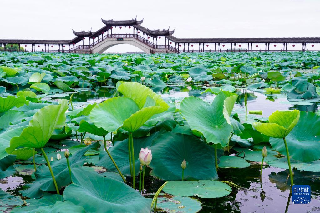 8月28日在江苏省昆山市锦溪古镇拍摄的荷塘和古莲桥。