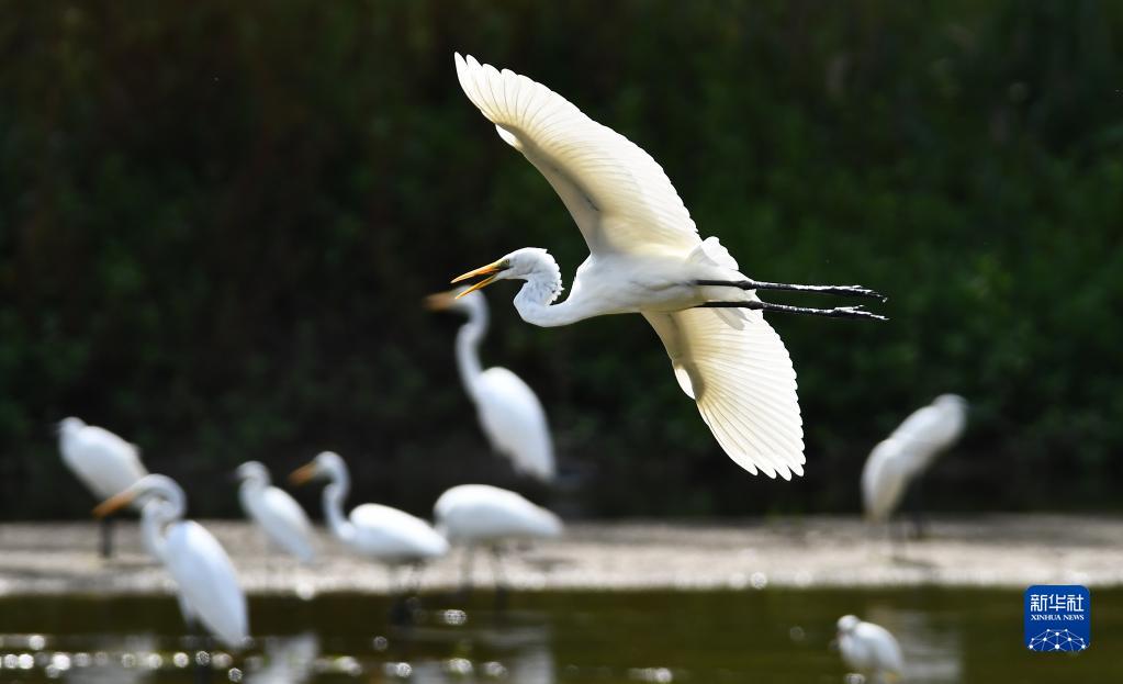 8月27日,白鹭在山东省滕州市境内的荆河水中飞舞。