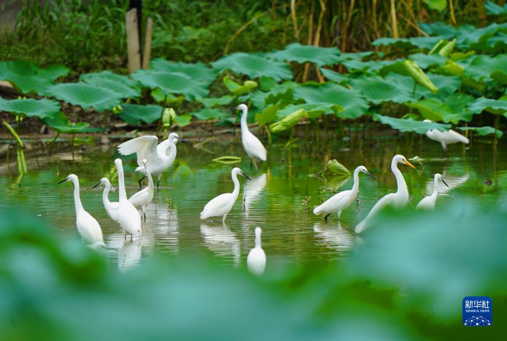 9月2日,在湖北省恩施土家族苗族自治州宣恩县贡水河国家湿地公园,成群的白鹭在休憩觅食。