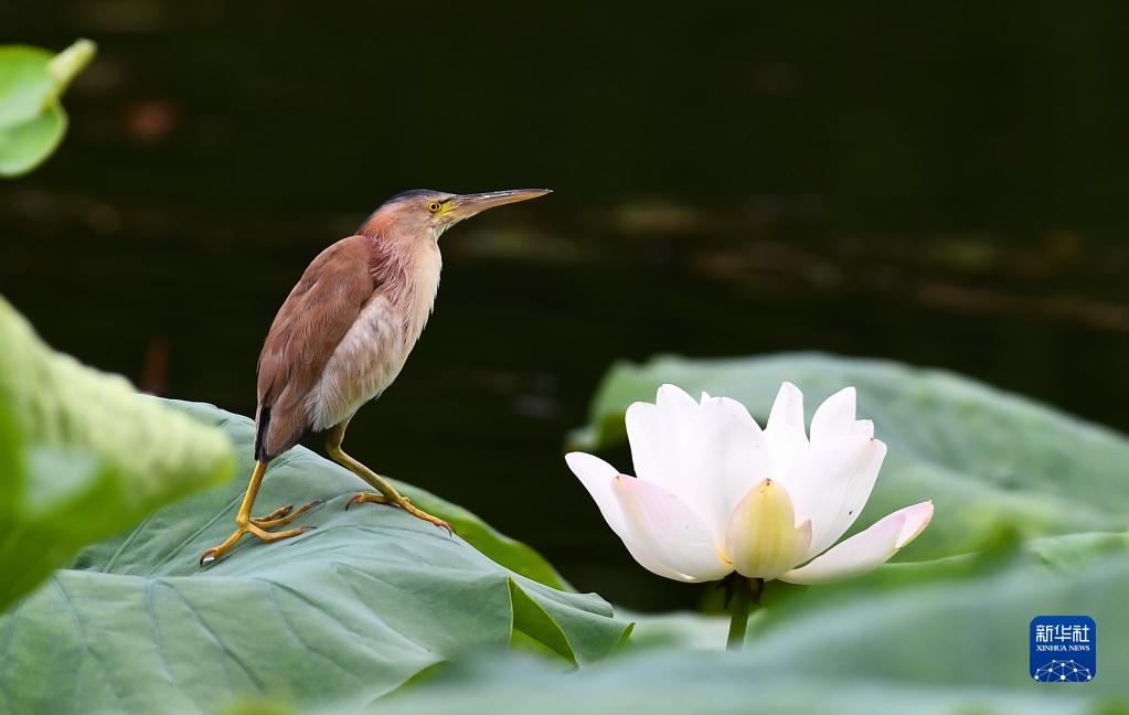 8月28日,在山东省滕州市荆河公园,一只水鸟停在荷花旁。