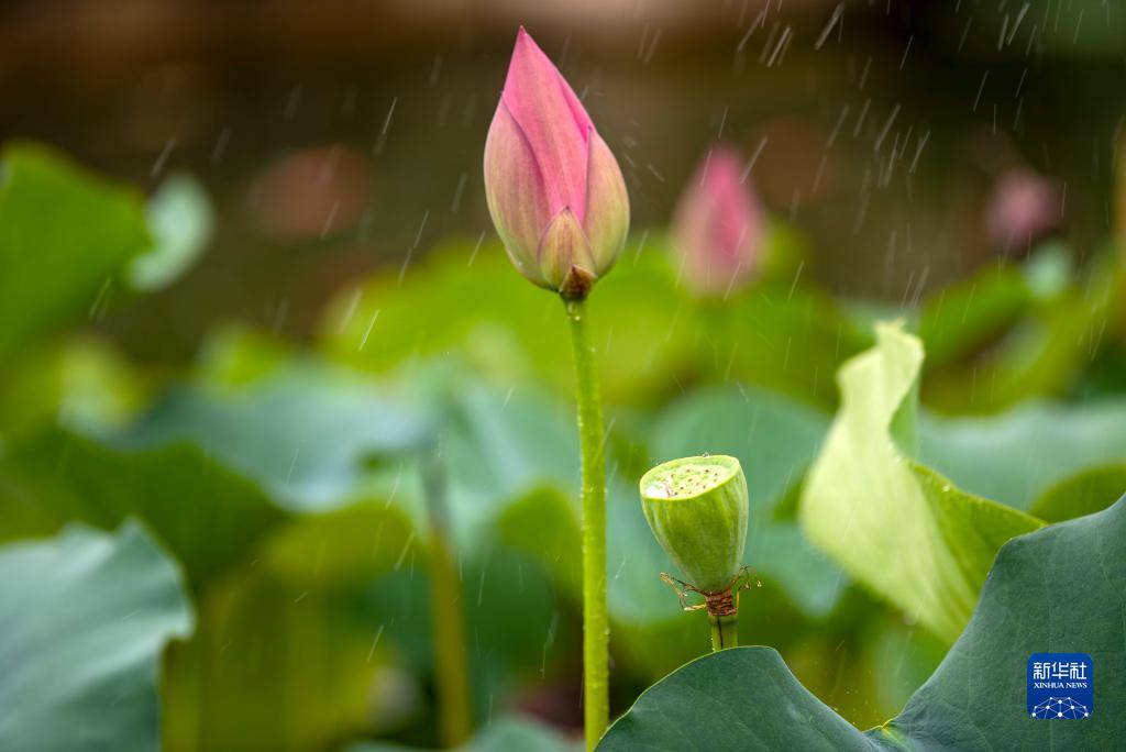 9月3日在江苏省泰州市海陵区一处池塘里拍摄的雨中荷花。