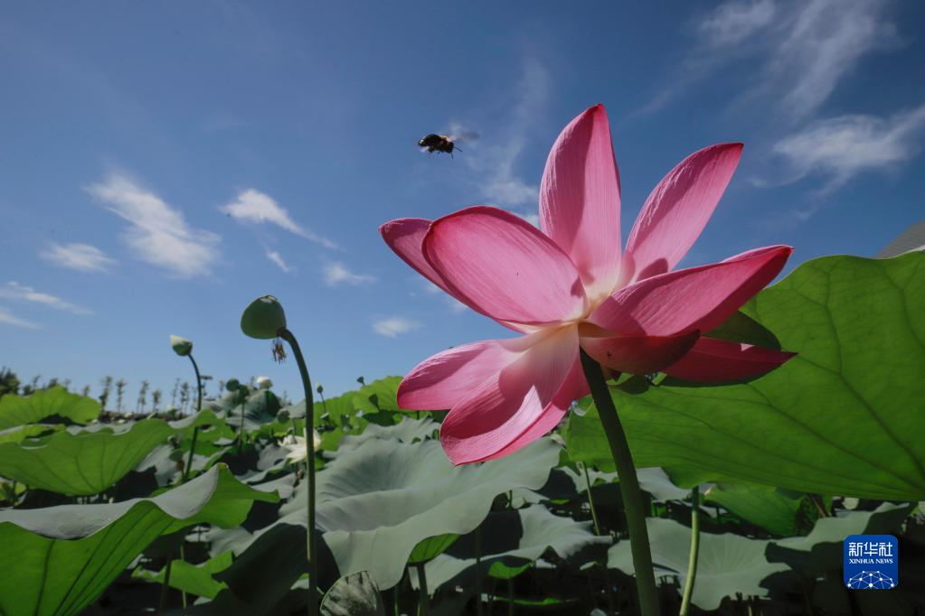 8月27日在河北省遵化市兴旺寨镇的一处荷花池拍摄的晴空下的荷花。