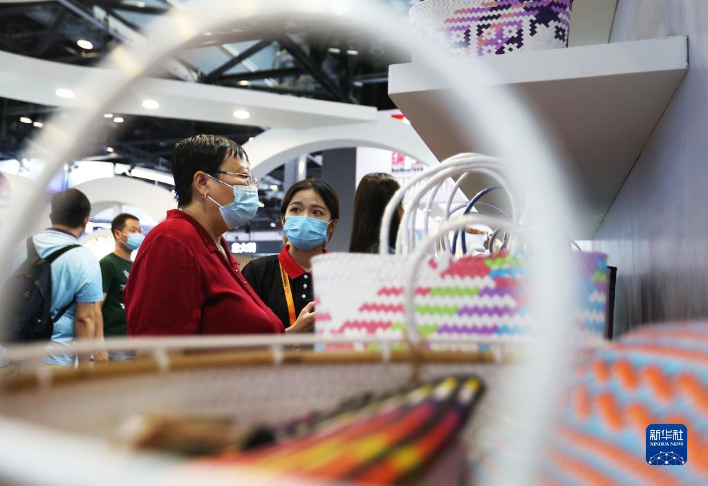 9月3日,参展商在服贸会国家会议中心展馆国别展区马来西亚沙捞越州展台为参观者介绍产品。