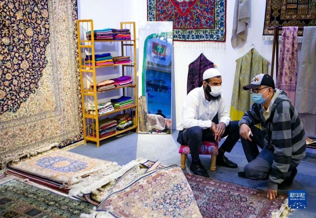 9月3日,参展商和参观者在服贸会国家会议中心展馆国别展区巴基斯坦展台洽谈业务。