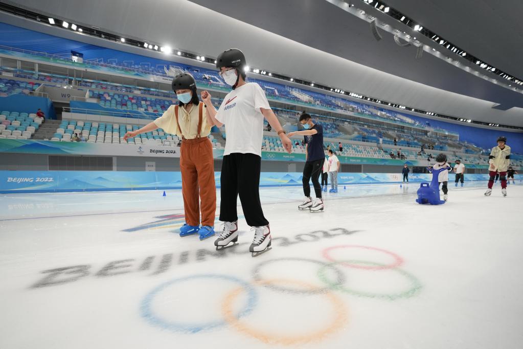 7月9日,游客在国家速滑馆体验滑冰。新华社记者 鞠焕宗 摄
