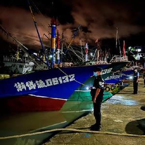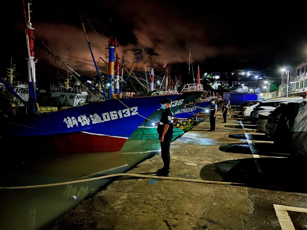 9月3日晚,岱山县公安检查码头渔船归港避风情况。(受访者供图)