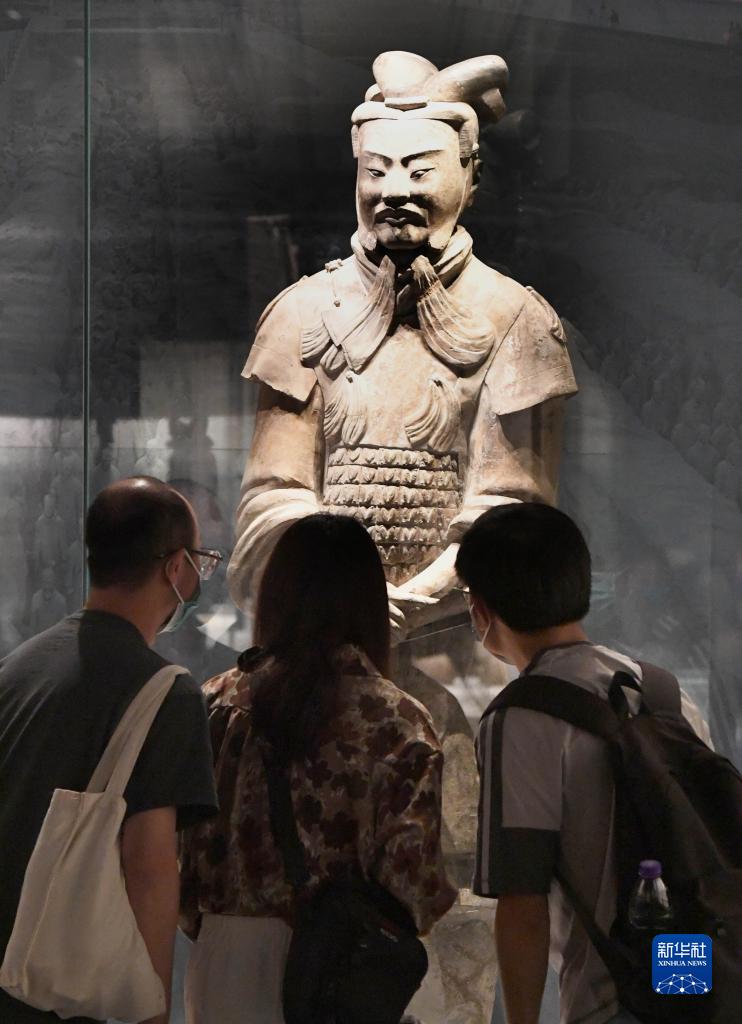 9月4日,参观者在“繁星盈天——中国百年百大考古发现展”上观看展品“高级铠甲军吏俑”。